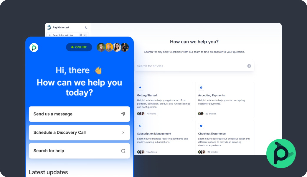 You’ll never be left on your own. PayKickstart comes with 24/7 live chat support, so whenever you need help, a real human is just a click away.