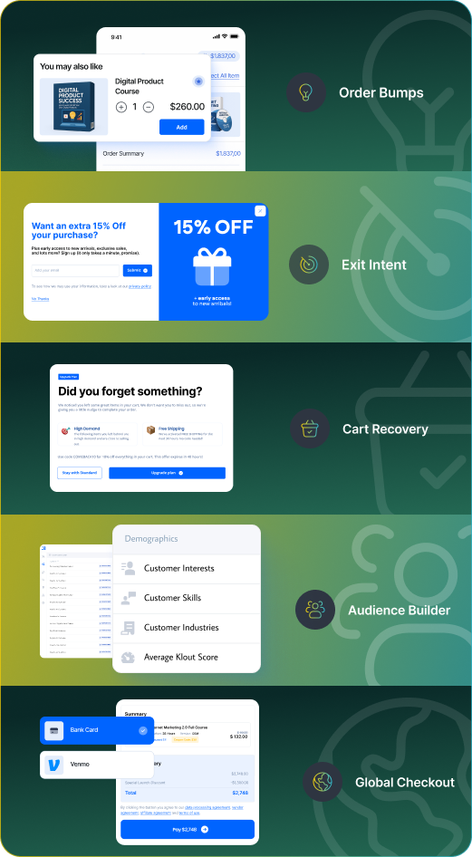 PayKickstart is packed with built-in tools proven to lift conversions, increase order value, and recover lost sales.